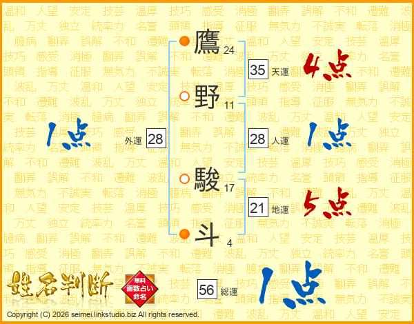 鷹(24画)野(11画) 駿(17画)斗(4画)