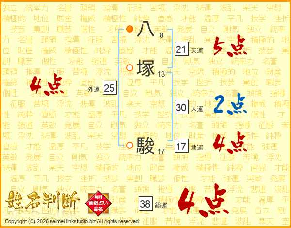 生活面を象徴する運勢です。外部から受ける影響力を表し、結婚運、家庭運や職場、環境への順応性を表します。総運から人運を引いた画数。姓や名が1文字の場合を除く。