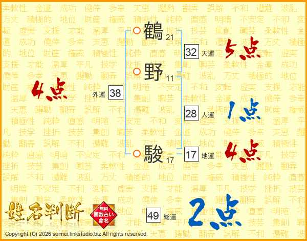 生活面を象徴する運勢です。外部から受ける影響力を表し、結婚運、家庭運や職場、環境への順応性を表します。総運から人運を引いた画数。姓や名が1文字の場合を除く。