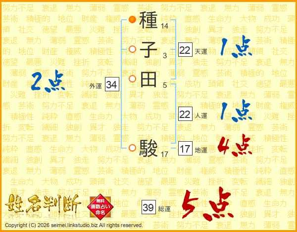 種子田駿さんの総運は39画の5点!