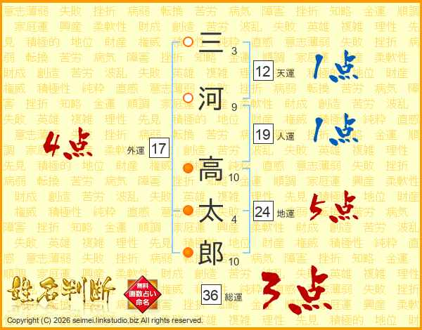 三(3画)河(9画) 高(10画)太(4画)郎(10画)