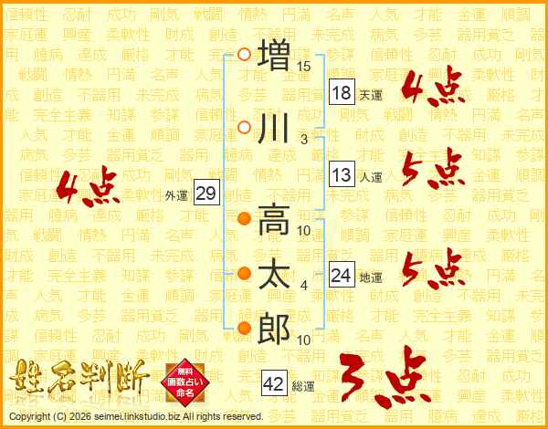 増(15画)川(3画) 高(10画)太(4画)郎(10画)