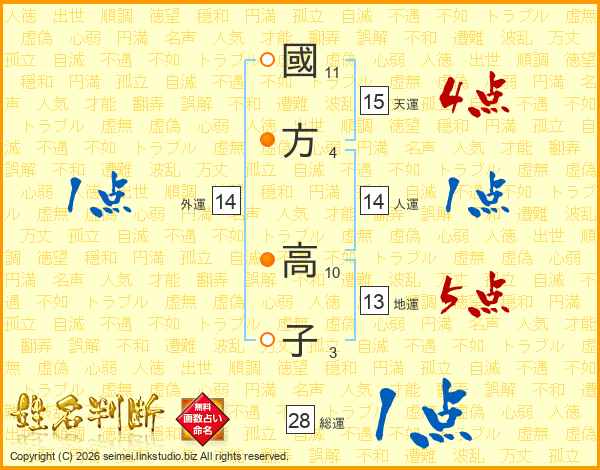 生活面を象徴する運勢です。外部から受ける影響力を表し、結婚運、家庭運や職場、環境への順応性を表します。総運から人運を引いた画数。姓や名が1文字の場合を除く。