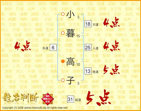 あなたの人生を表す1番重要な運勢です。生涯を通じて影響する総合運となり、主に50歳以降の晩年期に影響を及ぼします。苗字と名前の合計画数。