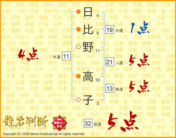 日(4画)比(4画)野(11画) 高(10画)子(3画)