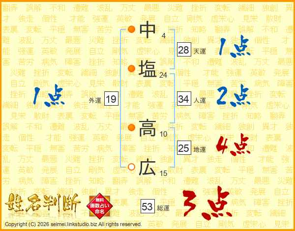 生活面を象徴する運勢です。外部から受ける影響力を表し、結婚運、家庭運や職場、環境への順応性を表します。総運から人運を引いた画数。姓や名が1文字の場合を除く。