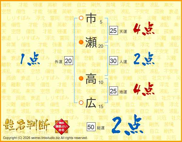 あなたの人生を表す1番重要な運勢です。生涯を通じて影響する総合運となり、主に50歳以降の晩年期に影響を及ぼします。苗字と名前の合計画数。