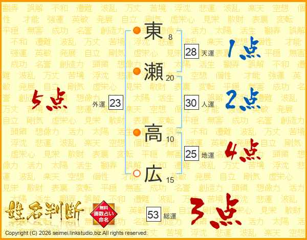 東瀬高広さんの地運は25画の4点!