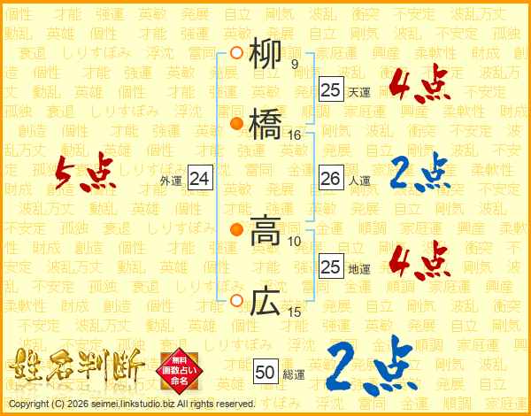 生活面を象徴する運勢です。外部から受ける影響力を表し、結婚運、家庭運や職場、環境への順応性を表します。総運から人運を引いた画数。姓や名が1文字の場合を除く。