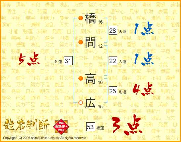橋間高広さんの地運は25画の4点!