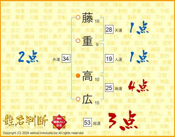 藤(19画)重(9画) 高(10画)広(15画)