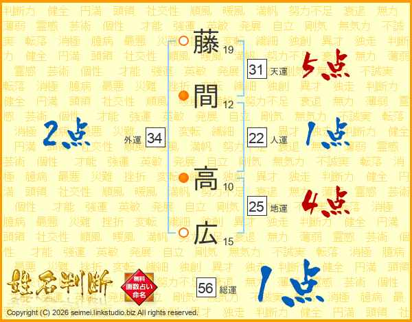 あなたの人生を表す1番重要な運勢です。生涯を通じて影響する総合運となり、主に50歳以降の晩年期に影響を及ぼします。苗字と名前の合計画数。