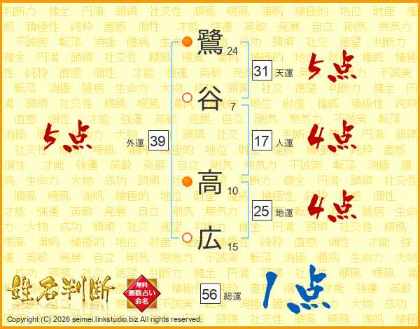 鷺(24画)谷(7画) 高(10画)広(15画)