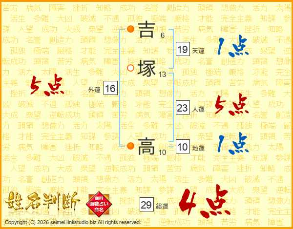 吉(6画)塚(13画) 高(10画)