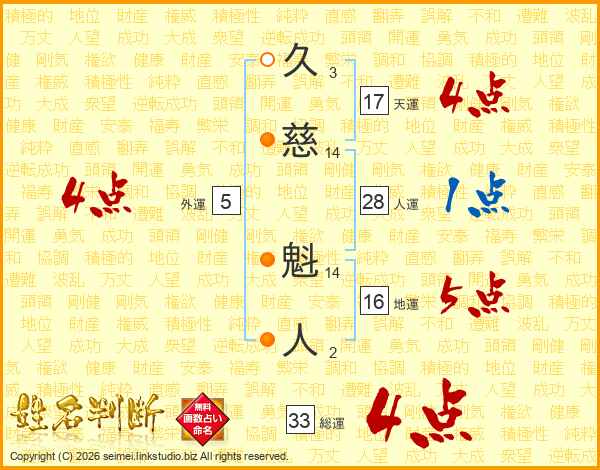 生活面を象徴する運勢です。外部から受ける影響力を表し、結婚運、家庭運や職場、環境への順応性を表します。総運から人運を引いた画数。姓や名が1文字の場合を除く。