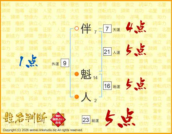 伴魁人さんの総運は23画の5点!