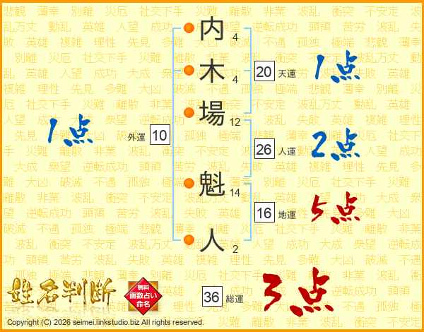 内(4画)木(4画)場(12画) 魁(14画)人(2画)