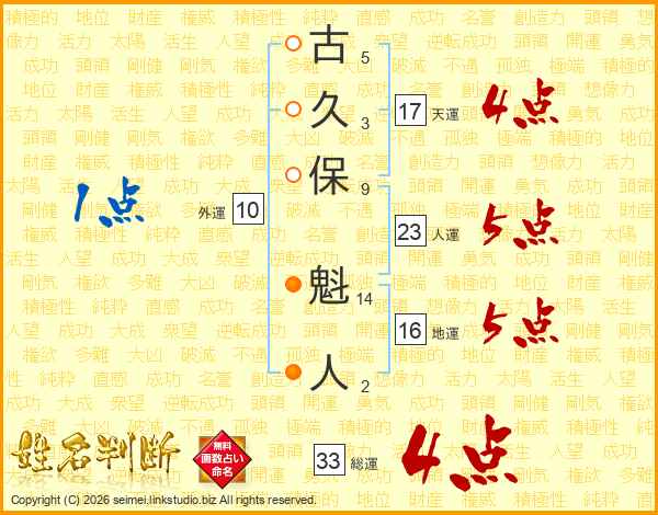 古(5画)久(3画)保(9画) 魁(14画)人(2画)