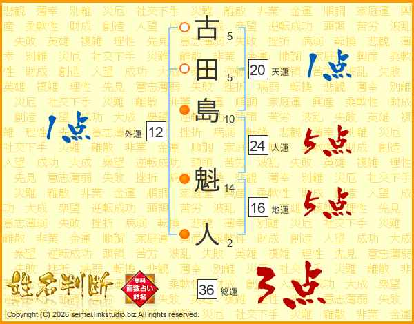 古(5画)田(5画)島(10画) 魁(14画)人(2画)