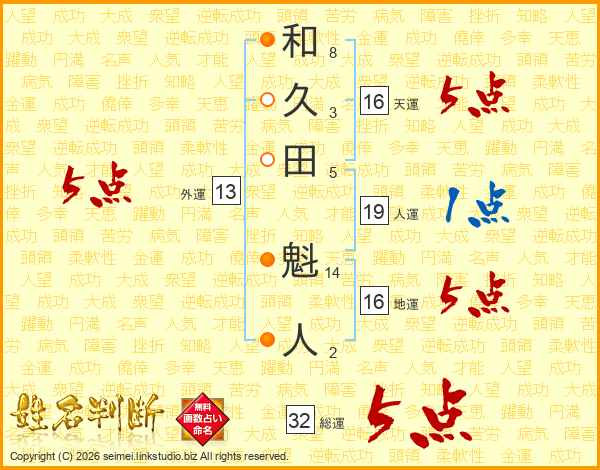 和(8画)久(3画)田(5画) 魁(14画)人(2画)