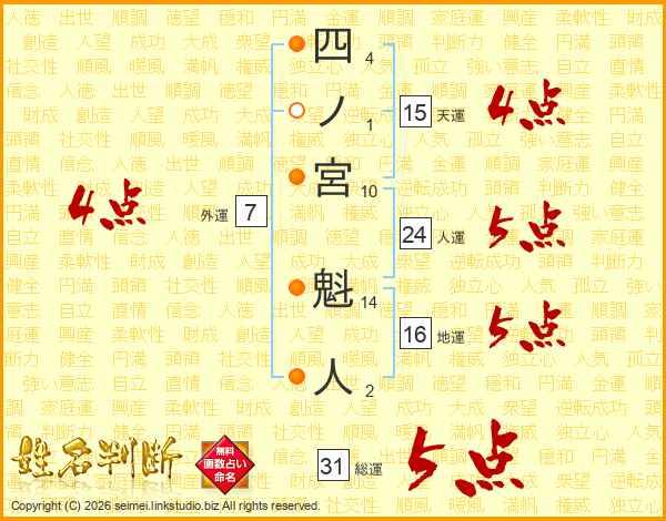 四ノ宮魁人さんの総運は31画の5点!