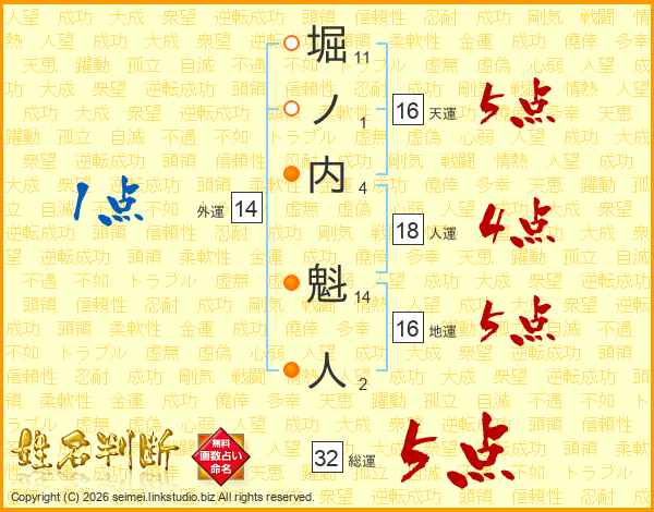 堀(11画)ノ(1画)内(4画) 魁(14画)人(2画)