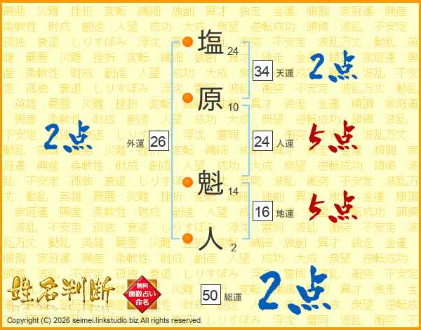 塩原魁人さんの人運は24画の5点!