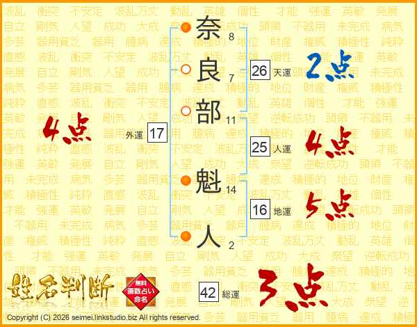 奈(8画)良(7画)部(11画) 魁(14画)人(2画)