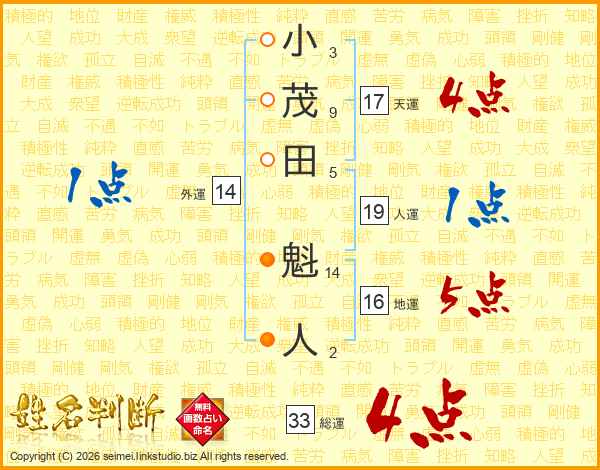 小(3画)茂(9画)田(5画) 魁(14画)人(2画)