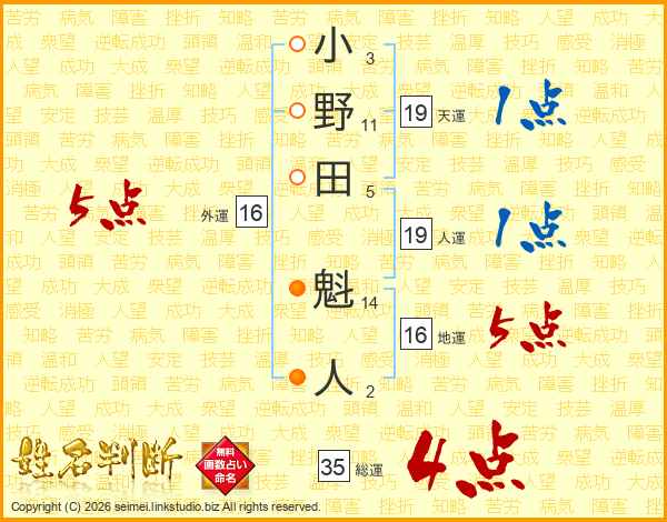 小野田魁人さんの外運は16画の5点!