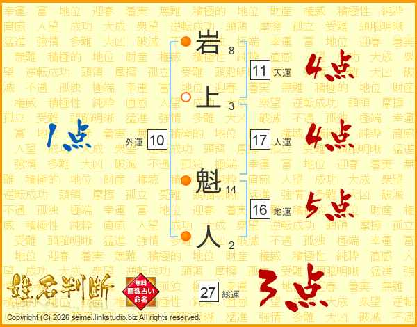 岩上魁人さんの総運は27画の3点!