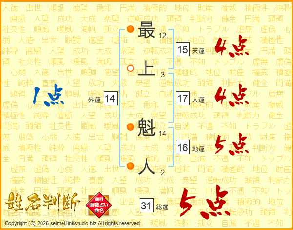 最上魁人さんの総運は31画の5点!