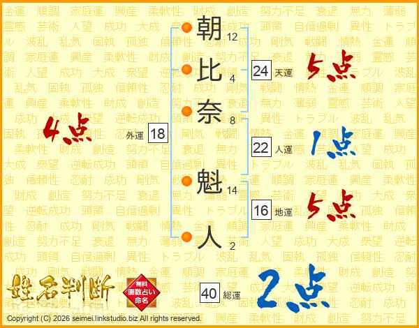 朝(12画)比(4画)奈(8画) 魁(14画)人(2画)
