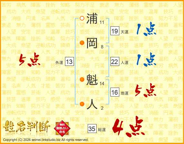 浦岡魁人さんの外運は13画の5点!