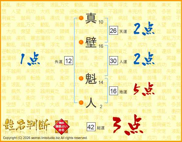 あなたの人生を表す1番重要な運勢です。生涯を通じて影響する総合運となり、主に50歳以降の晩年期に影響を及ぼします。苗字と名前の合計画数。