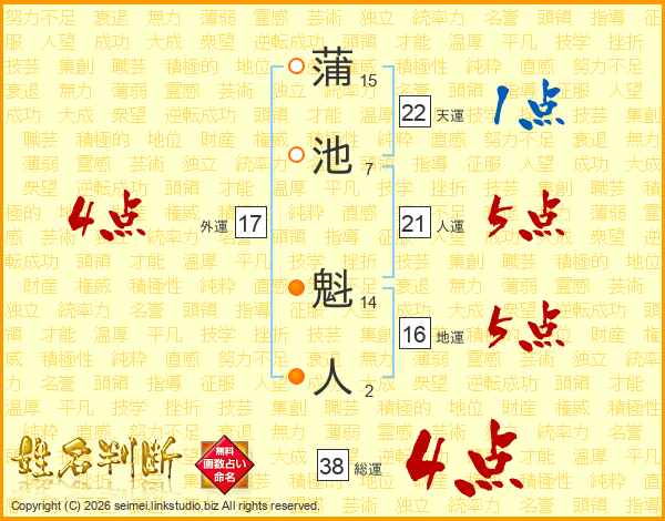 蒲池魁人さんの総運は38画の4点!