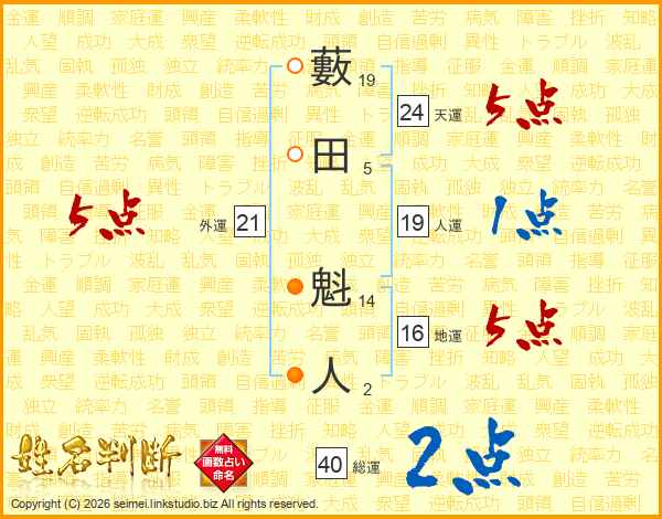 藪田魁人さんの総運は40画の2点!