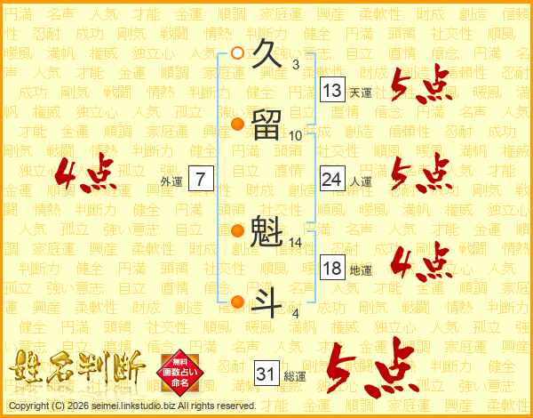 久留魁斗さんの総運は31画の5点!