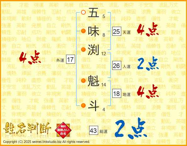 五(5画)味(8画)渕(12画) 魁(14画)斗(4画)