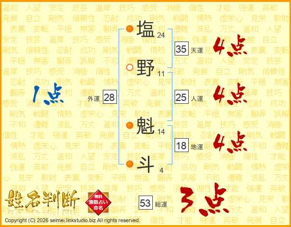 塩(24画)野(11画) 魁(14画)斗(4画)