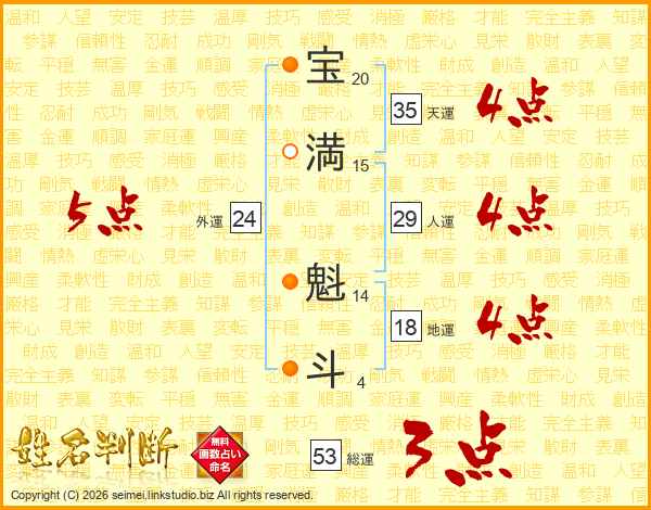 宝(20画)満(15画) 魁(14画)斗(4画)