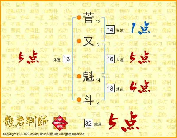 菅又魁斗さんの総運は32画の5点!