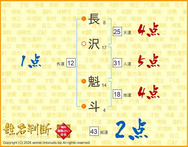 長(8画)沢(17画) 魁(14画)斗(4画)