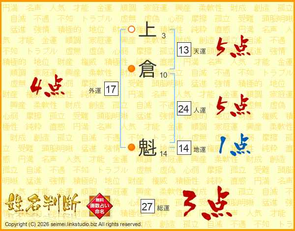 生活面を象徴する運勢です。外部から受ける影響力を表し、結婚運、家庭運や職場、環境への順応性を表します。総運から人運を引いた画数。姓や名が1文字の場合を除く。