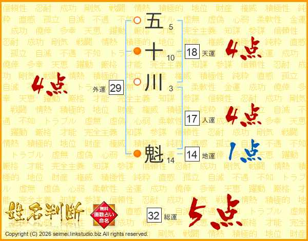 生活面を象徴する運勢です。外部から受ける影響力を表し、結婚運、家庭運や職場、環境への順応性を表します。総運から人運を引いた画数。姓や名が1文字の場合を除く。