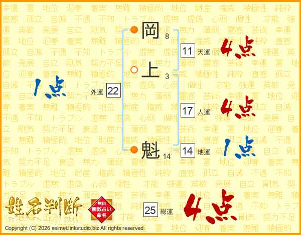 岡(8画)上(3画) 魁(14画)