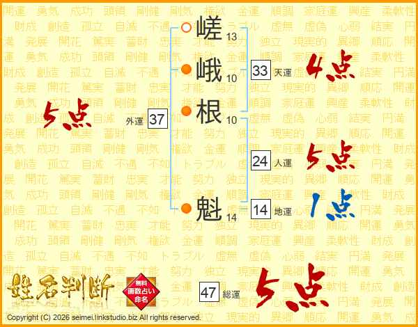 嵯峨根魁さんの総運は47画の5点!