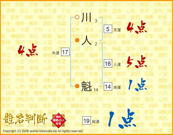 生活面を象徴する運勢です。外部から受ける影響力を表し、結婚運、家庭運や職場、環境への順応性を表します。総運から人運を引いた画数。姓や名が1文字の場合を除く。