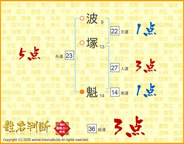 生活面を象徴する運勢です。外部から受ける影響力を表し、結婚運、家庭運や職場、環境への順応性を表します。総運から人運を引いた画数。姓や名が1文字の場合を除く。