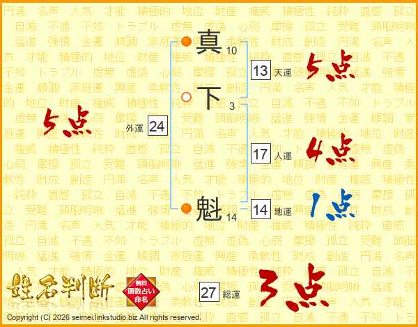 真下魁さんの総運は27画の3点!